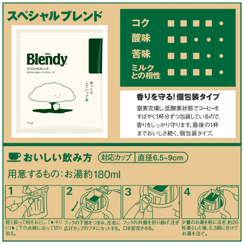 ●種別:スペシャル・ブレンド●入数:100袋●内容量(個装):7g●湯量目安:約180mL●ブランド:AGF ブレンディ●カテゴリー:ドリップコーヒー●軽減税率:対象●製造国:ベトナム/コロンビア/他●メーカーの都合によりパッケージや仕様などが変更になる場合がございますので、あらかじめご了承ください。 ●最小出荷単位: 1