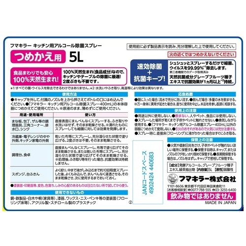 ●内容量[mL]:5000●内容量:5L●液性:弱酸性●成分:発酵アルコール54%(容量%)、グレープフルーツ種子エキス、緑茶抽出物●種別:つめかえ用●付属品:つめかえ用ノズル●製造国:日本 ●最小出荷単位: 1