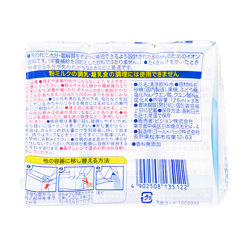 ●入数:3本●内容量:125mL●カロリー:1本当たり18kcal●3カ月~※発育には個人差がございますので、表示の適正年齢は参考としてください。●容器形状:紙パック●アレルギー物質(28品目)を含む原材料を使用しておりません。●軽減税率:対象●※商品の改訂などにより、お手元の商品と記載内容が異なる場合がございます。必ずお手元の商品を確認してから、お召し上がりください。●メーカーの都合によりパッケージや仕様などが変更になる場合がございますので、あらかじめご了承ください。 ●最小出荷単位: 1