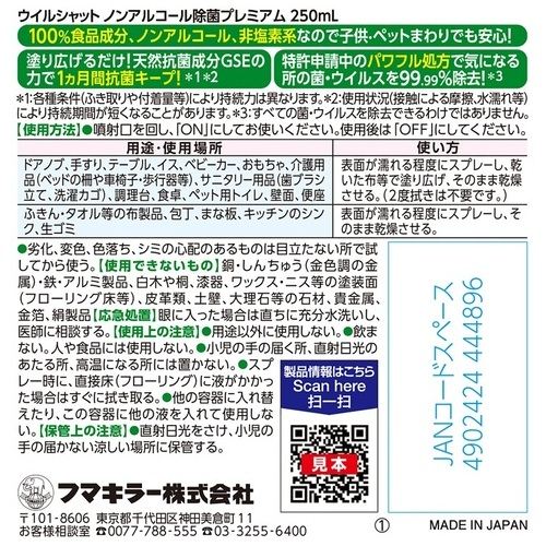 ●内容量[mL]:250●内容量:250mL●使用用途:ドアノブ、手すり、テーブル、イスなど●成分:GSE(グレープフルーツ種子エキス)、pH調整剤(食品添加物)●種別:ノンアルコール●注意事項:すべての菌・ウイルスを除去できるわけではありません。●抗菌効果の持続期間(目安):約1か月●※各種条件(ふき取りや付着量等)により持続力は異なります。※使用状況(接触による摩擦、水濡れ等)により持続期間が短くなることがあります。●製造国:日本 ●最小出荷単位: 1