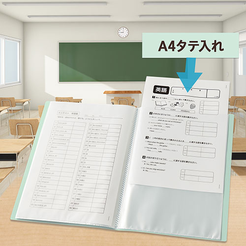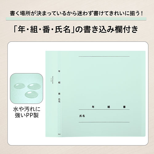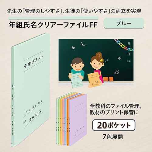 プリントに穴をあけずにファイリングするポケット式のクリアーファイル。学校で定番のフラットファイルと同じデザインで、表紙と背表紙に直接記名ができるので、先生の「管理のしやすさ」と生徒の「使いやすさ」の両立を実現。