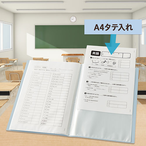 プリントに穴をあけずにファイリングするポケット式のクリアーファイル。学校で定番のフラットファイルと同じデザインで、表紙と背表紙に直接記名ができるので、先生の「管理のしやすさ」と生徒の「使いやすさ」の両立を実現。