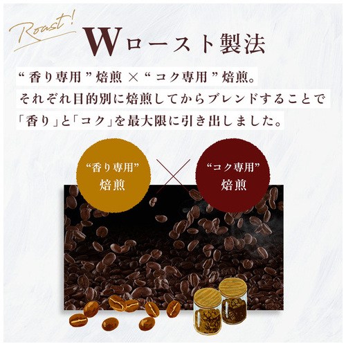 ナチュラル精製豆(アンウォッシュド)50%以上使用。 香りとコクのWロースト製法で奥行きのある味わいに。豊かなコクのリッチな味わい。