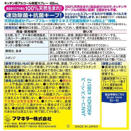 ●内容量[mL]:400●内容量:400mL●液性:弱酸性●成分:発酵アルコール49%(容量%)、グレープフルーツ種子エキス、緑茶抽出物●種別:本体●製造国:日本 ●最小出荷単位: 1