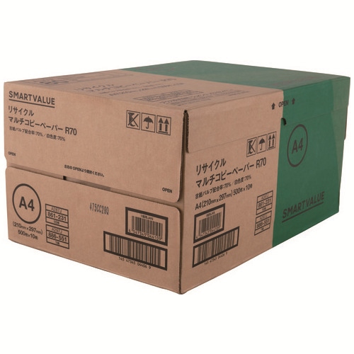 ●紙質:中性紙●繊維方向:長辺方向(縦目)●生産国:日本●紙厚(坪量):約97μm(約64g/㎡)●坪量:約64g/㎡●白色度:ISO約69%●対応機種:カラーコピー機、モノクロコピー機、カラーレーザー、モノクロレーザー、インクジェット、ファクシミリ●外箱タイプ:ラップラウンド式(ミシン目タイプ)●古紙パルプ配合率:70%●規格:A4●注意事項:商品供給の安定を図るため、製造工場及び仕様の変更をさせて頂く事がございます。●市況価格や原材料価格の都合により、ご提供の価格を変更させて頂く場合がございます。●入数:5000枚(500枚×10冊)●まとめ買い●リサイクルマルチコピーペーパーR70 <白色度約69%> ●最小出荷単位: 1
