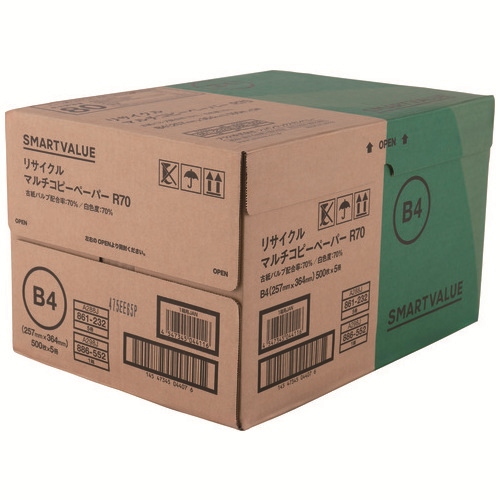 ●紙質:中性紙●繊維方向:長辺方向(縦目)●生産国:日本●紙厚(坪量):約97μm(約64g/㎡)●坪量:約64g/㎡●白色度:ISO約69%●対応機種:カラーコピー機、モノクロコピー機、カラーレーザー、モノクロレーザー、インクジェット、ファクシミリ●外箱タイプ:ラップラウンド式(ミシン目タイプ)●古紙パルプ配合率:70%●規格:B4●注意事項:商品供給の安定を図るため、製造工場及び仕様の変更をさせて頂く事がございます。●市況価格や原材料価格の都合により、ご提供の価格を変更させて頂く場合がございます。●入数:2500枚(500枚×5冊)●まとめ買い●リサイクルマルチコピーペーパーR70 <白色度約69%> ●最小出荷単位: 1