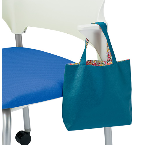 背の仕様が選べるミーティングチェア/背パッドなしキャスター脚/ブルー。背には移動に便利な持ち手穴付き。肘はハーフ肘でカバンなどのちょっとした荷物を掛けられます。