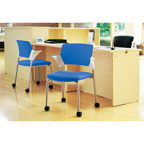 背の仕様が選べるミーティングチェア/背パッド付キャスター脚/ブルー。背にはパッド付。肘はハーフ肘でカバンなどのちょっとした荷物を掛けられます。