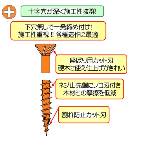 ●半ねじ●材質…鉄鋼線(クロメート)●(+)特殊フレキ頭●サイズ…太さ:4.7mm、長さ:90mm、頭径:9.0mm、線材径:3.2mm●入数…74本●家具造り、堅木に最適です。●下穴無しで、一発締付。施工性を重視。●十字穴が深く潰れ難い。●座堀り用カット刃で、硬木に使え仕上りが綺麗。●ネジ山先端がノコギリ刃なので、木材との摩擦が低減。●先端が特殊カット刃で、自ら下穴を空けながらはいるので、木割れしにくく、硬木もラクに入ります。●参考在庫数・商品詳細・サイズ情報はメーカー(参考)URLからもご確認いただけます。 ●最小出荷単位: 1