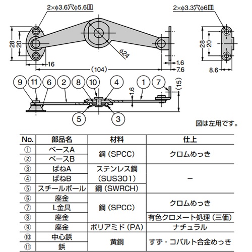 ●全長…104mm●用途…左用●材質…鋼(クロムメッキ仕上げ)●穴径…3.3・3.6mm●重量…33g●引張荷重…30.4kgf●取付ねじ無し●キャッチ機構付●※扉の重量によっては、キャッチ機構が効かない場合もあります。●参考在庫数・商品詳細・サイズ情報はメーカー(参考)URLからもご確認いただけます。 ●最小出荷単位: 1