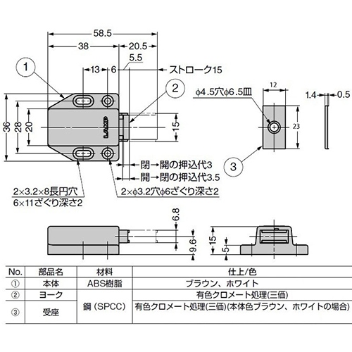 ●吸着力…1.6kg●カラー…ホワイト●材質…ABS、スチール●穴径…3.2×8mm、3.2mm、4.5mm●付属品…受座、十字穴付丸木ねじ3.1×13 (4本)、十字穴付皿木ねじ2.7×13 (1本) 有色クロメート処理(三価)●重量…22g●指先で軽く押すだけで扉の開閉が可能です。●参考在庫数・商品詳細・サイズ情報はメーカー(参考)URLからもご確認いただけます。 ●最小出荷単位: 1