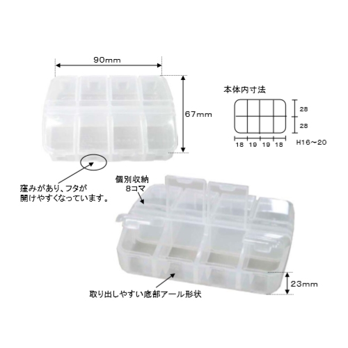 ●メーカー…リングスター●型番…PT-98●サイズ…90×67×23(H)mm●個別収納…8コマ●材質…耐衝撃性コポリマー●重量…20g●個別フタ付きシングルスペースで小物収納に最適です。●取り出しやすいアール加工です。●ポケットに収まりやすい形状です。●参考在庫数・商品詳細・サイズ情報はメーカー(参考)URLからもご確認いただけます。 ●最小出荷単位: 1