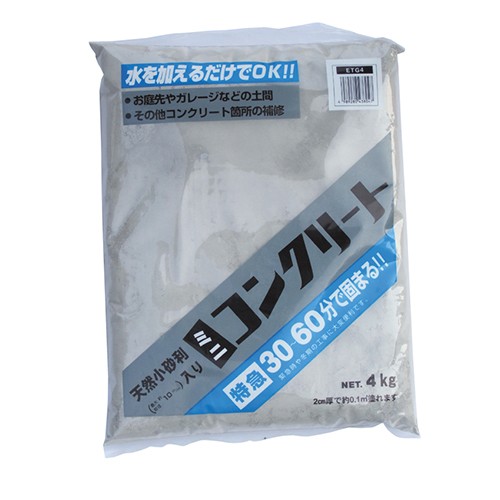 ●メーカー…サンホーム工業●型番…ETG4●内容量…4kg●施工面積…320×300mm(約20mm厚)●成分…ポルトラントセメント、川砂利●お庭先やガレージなどの土間、その他コンクリート箇所の補修に。●天然小砂利(最大粒径約10mm)入りのため、砕石と違い塗りやすく、仕上がりもキレイです。●水を加えるだけで手軽に使えます。●使用温度範囲…常温●硬化時間…約30~60分(水温・気温によって変わります。)●参考在庫数・商品詳細・サイズ情報はメーカー(参考)URLからもご確認いただけます。 ●最小出荷単位: 1