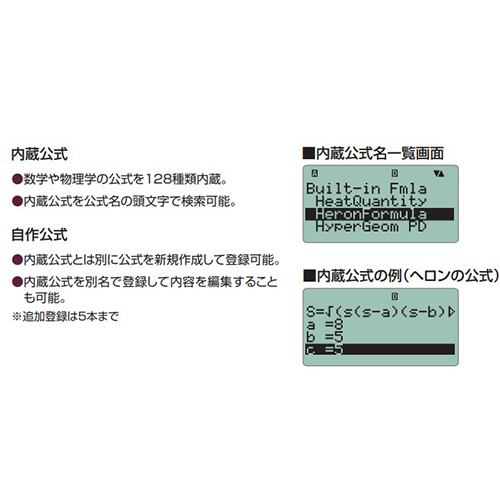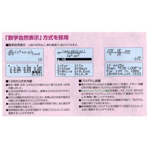 ●メーカー…カシオ(CASIO)●型番…FX-5800P●桁数…10桁●サイズ…81.5(W)×163(D)×15.1(H)mm●電源…単4電池×1個(付属)●重量…150g●液晶ディスプレイ…数学自然表示書式通り入力方式フルドット液晶●基本計算…四則計算カッコ計算分数計算度分秒(60進数)計算逆数計算パーセント計算(関数機能)階乗計算πの入力πを含む計算結果表示無理数(√)計算数値丸め機能●応用計算…マルチステートメント機能連続演算機能リプレイ機能マルチリプレイ機能カルク機能ソルブ機能内蔵公式128本●高機能計算…超越数:eの入力n進計算(2進・8進・16進)論理演算複素数計算行列計算数値微分計算数値積分計算●基本関数機能…絶対値計算2乗計算べき乗計算べき乗根計算三角関数計算逆三角関数計算双曲線関数・逆双曲線関数指数計算対数計算底指定の対数計算座標変換(Pol, Rec)順列・組合せ計算整数抽出機能乱数発生機能乱数発生機能(整数の乱数)総和(Σ)計算●理化学関連機能…科学定数(40)●その他関数機能…連立方程式・高次方程式の解法●統計データ…統計データ編集機能(LIST)●統計計算…1変数の統計計算2変数の統計・回帰計算正規分布確率演算●メモリー…26~2398メモリー独立メモリー(M、M+、M-キー方式)アンサーメモリー(Ans.)メモリー保護機能Reset機能●キーの特徴…プラスチックキー●キーの機能…早打ち機能(2キーロールオーバー)負符号(-)電源オフ機能●電池寿命…約1年(1日1時間使用時)●表示設定…小数点以下桁数設定(Fix)有効桁数設定(Sci)指数表示範囲設定(Norm)エンジニアリング・シンボル表記ENG変換機能計算結果の切換え(S⇔D)●プログラム容量…最大28,500バイト●407関数●2進、8進、16進計算、論理演算、2変数統計、分数計算、積分計算、メモリ保護機能●複雑な繰り返し計算もスピーディーに処理でき、式と計算結果が見やすい4行表示採用のプログラム関数電卓。●基本的な関数計算や統計計算、更に高度な計算機能を搭載。●数学・物理・化学・土木などの分野で良く使う128本の公式を搭載し、自作公式5本の登録も可能です。●一体型ハードカバー●※付属電池はテスト電池ですので新しい電池をご購入下さい。●参考在庫数・商品詳細・サイズ情報はメーカー(参考)URLからもご確認いただけます。 ●最小出荷単位: 1