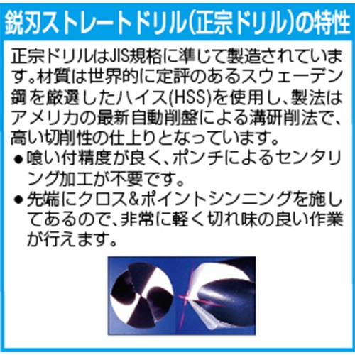 ●材質…HSS(ハイス)●刃先径…3.2mm●全長…71mm●溝長…42mm●対応被削材…構造用鋼、低炭素鋼、高炭素鋼、合金鋼、鋳鉄、アルミニウム合金、銅合金●入数…2本●(エクストラ正宗)●クロス&ポイントシンニング付●喰い付精度が良く、センタリング加工不要●ステンレス、合金難削材等の穴あけに2倍以上の重切削が可能(送り速さ)で、又一段階アップの高速ドリリングができます。●センターリング性能が良いためポンチは不要、穴径精度が良く揃います。●先端ウェブに特殊なクロス&ポイントシンニングを施してあるので喰い込みが良く進行するので、すばらしい切れ味が得られます。●標準ドリルに見られる切れずに空転(刃先こすり摩擦による摩耗)が少ないので通常回転ならば数倍の耐久性があります。●回転数アップ、送り早さアップ、耐久性アップで能率が上がると共に再研磨の回数が減り、ランニングコストがぐんと下がります。●参考在庫数・商品詳細・サイズ情報はメーカー(参考)URLからもご確認いただけます。 ●最小出荷単位: 1