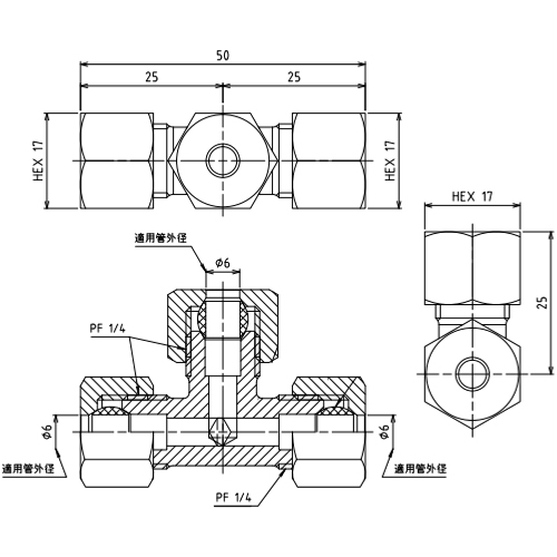 ●メーカー…アソー(ASOH)●型番…RT-3206●適用管外径…6mm●ナット六角対辺…17mm●面間…50mm●使用圧力…3.45MPa以下●使用温度…-50~150℃●使用流体…空気・水・油●材質…真鍮●入数…1個●リング玉3個付属●分岐もしくは集合用のリングジョイントです。●参考在庫数・商品詳細・サイズ情報はメーカー(参考)URLからもご確認いただけます。 ●最小出荷単位: 1