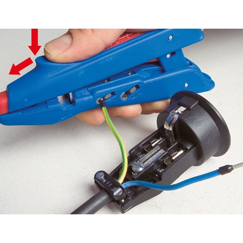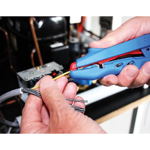 ワイヤーを挟んでスライドさせるだけで被覆の切込深さを自動調整