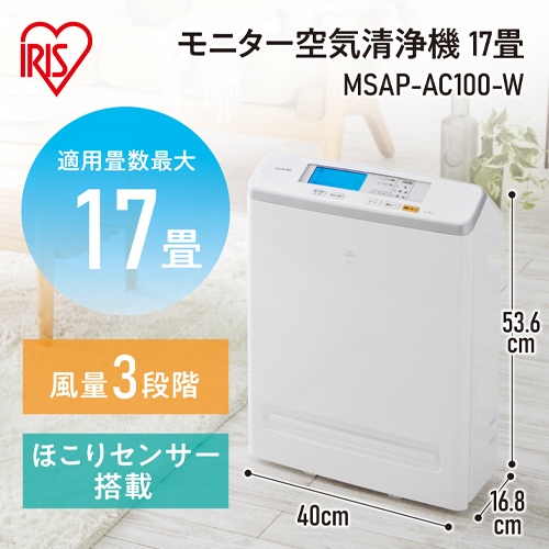 ●メーカー…アイリスオーヤマ(IRIS OHYAMA)●型番…MSAP-AC100●消費電力(50/60Hz)…静音:38/35W標準:54/57W強:71/81Wターボ:85/108W●サイズ…400(W)×168(D)×536(H)mm●重量…5.5kg●適用床面積…28m2(17畳)●電源…AC100V(50/60Hz共用)●運転モード…静音/標準/強/自動/ターボ●風量(50/60Hz)…静音:1.2/1.0m3/分標準:2.9m3/分強:3.4/3.2m3/分ターボ:3.7/3.9m3/分●運転音(50/60Hz)…静音:28/25 dB標準:48/42 dB強:50/49 dBターボ:53/55 dB●コードの長さ…2m●替フィルター…EA763AD-102、EA763AD-103●高感度ほこりセンサーで空気の汚れを常にチェックし、すばやく清浄●大型モニターに表示された数値とバックライトの色で空気のキレイが見えるから安心。●集塵フィルター(HEPAフィルター)・活性炭フィルター・プレフィルターが高い空気洗浄力を発揮し、花粉・ほこり・においを除去します。●空気の汚れをスピード清浄ターボモードでお部屋の空気を一気にきれいに。3方向の吸気口から汚れた空気をぐんぐん吸引します。●大型モニターでほこりの量を数値化高感度ほこりセンサーが「目に見えない空気の汚れ」を測定。ほこりの濃度をグラフと数値で表示します。●汚れの度合いに応じて運転を切り替える「自動運転モード」で賢く省エネ。●広い空間もしっかり清浄広い空間にも対応できるので、リビングにもおすすめ。フラップを動かして、風向きの調節も可能。●参考在庫数・商品詳細・サイズ情報はメーカー(参考)URLからもご確認いただけます。 ●最小出荷単位: 1