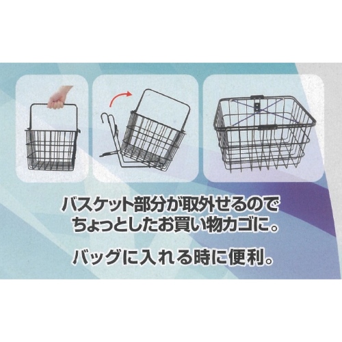 ●使用時サイズ(収納時サイズ)W×D×H(mm)…335×270×210(290×230×210)●積載重量…5kg●重量…1.3kg●材質…バスケット・ブランケット:鉄(PEコーティング)ストレッチコード部:天然ゴムフック部:鉄(亜鉛メッキ)●取付ハンドル径…約φ25.4mmまで●取付ステム径…約φ37mm●付属品…ストレッチコード●折りたたみ自転車用 前かご●フックで折りたたみ自転車にワンタッチで取付できます。●バスケット部分が取り外せるのでちょっとしたお買い物かごにも使用できます。●参考在庫数・商品詳細・サイズ情報はメーカー(参考)URLからもご確認いただけます。 ●最小出荷単位: 1