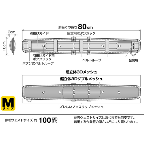 ●メーカー…TJMデザイン(TaJIma)●型番…CKRX800●長さ…800mm●幅…100mm●参考ウエストサイズ…約100cmまで ※あくまで参考サイズです。作業服の厚さによりことなります●特長…通気性抜群の超立体3Dダブルメッシュでムレ防止●材質…本体:ポリプロピレン、Wラッセル等生地:ポリエステル等金属部:ステン・スチール●重量…420g●ベルトループ数:5●ノンスリップメッシュ構造です。●型崩れしないリベットロック構造です。●軽涼・快適で驚きの装着感です。●墜落制止用器具は別売です。●50mm幅ベルト専用(厚生労働省「安全帯の規格」適合品)●SEG(サスペンダー・ハーネス対応)SEGマークのあるサスペンダー・ハーネスと組み合わせて使用できます。●通気性抜群の超立体3Dダブルメッシュでムレ防止●参考在庫数・商品詳細・サイズ情報はメーカー(参考)URLからもご確認いただけます。 ●最小出荷単位: 1