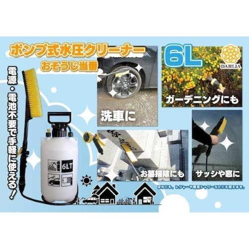 ●容量(L)…6●サイズ(mm)…φ180×435(H)●重量(kg)…1.36●ホース長…1500mm●材質…本体・シャワーヘッド・ブラシ:ポリプロピレン タンク:ポリエチレン 耐圧ホース:軟質ビニール樹脂●ブラシ長…220mm●付属品…シャワーヘッド、40×230mmブラシノズルセット●加圧式スプレー●電源・電池不要の水圧クリーナーで、水道設備がない場所での洗車や散水に便利です。●ブラシもシャワーも取り付け、取り外しは簡単ワンタッチ●温水(50℃位まで)も使えるので、緊急時の簡易シャワーなどにも活用できます●軽くてコンパクト! 肩掛けストラップ付で散水中の移動もラクラク●レバーをロックでらくらく連続散水●参考在庫数・商品詳細・サイズ情報はメーカー(参考)URLからもご確認いただけます。 ●最小出荷単位: 1
