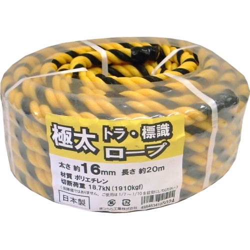 ●サイズ…φ16mm×20m●引張強度…約18.7kN(約1910kgf)●材質…ポリエチレン●構造…三つ打ち●重量(g)…2600●カラー…黄/黒(トラ柄)●ロープ本体の強度はありますが、材質的にスリップしやすいので、荷役作業やトラック荷締め作業には使用しないでください。●境界線や、立ち入り禁止警告標示、工場や駐車場の区画標示や危険な場所の注意喚起、野積シート押さえや固定に●参考在庫数・商品詳細・サイズ情報はメーカー(参考)URLからもご確認いただけます。 ●最小出荷単位: 1