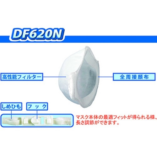 ●メーカー…三光化学工業●型番…DF620N●商品名…シルキーマスク●捕集効率…基準値:95.0%以上平均値:99.47%●吸気抵抗…基準値:50Pa以下平均値:32Pa●排気抵抗…基準値:50Pa以下平均値:29Pa●二酸化炭素濃度上昇値…基準値:1.0%以下平均値:0.5%●吸気抵抗上昇値…基準値:250Pa以下平均値:121Pa●ぬれ抵抗値…基準値:50Pa以下平均値:26Pa●使用限度時間…11時間●仕様…締め紐調節式●国家検定合格品[区分DS2]●伸縮する全周接顔クッションを採用。鼻/あご部分の柔軟性が大幅アップ。●しめひもには取替え式のように長さ調節ができるフック式の留具を採用。更にループ式にすることでマスクの付け外しが楽になりました。●鼻部の形状をすっきりさせたことにより、ゴーグルや保護メガネと併用できます。●マスクを外した時に、ひも痕が残りにくくかぶれにくい、より肌にやさしい幅広編みゴムのしめひもを採用しました。●金属部品を使用しない、ECO対応のマスクです。●参考在庫数・商品詳細・サイズ情報はメーカー(参考)URLからもご確認いただけます。 ●最小出荷単位: 1