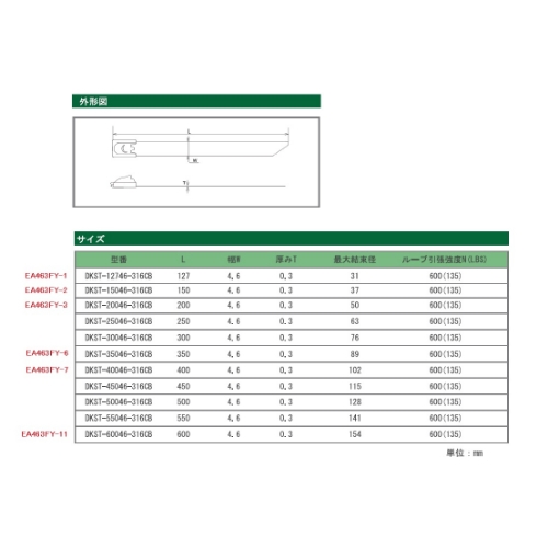 ●メーカー…デンカエレクトロン●型番…DKST-35046-316CB●全長…350mm●幅…4.6mm●厚み…0.3mm●最大結束径…89mm●耐荷重…61kgf(600N)●材質…ステンレス(SUS316)+エポキシ樹脂コーティング●使用温度範囲…-60~150℃●入数…10本●あらゆる環境下で使用可能なステンレスの結束バンドです●屋内外はもちろん、地下施設や海中など過酷な環境でのご使用に適しています。●先端1mmでも簡単にロックがかかり、ボールとタイの強い摩擦力で強力な結束力が得られるため外れません。●結束バンド全体に面取りが綺麗に施されておりますので、安全に使用できます。●樹脂コーティングが施されておりますので、結束した際に線材を傷付けません。●手締め用●RoHS10対応品●参考在庫数・商品詳細・サイズ情報はメーカー(参考)URLからもご確認いただけます。 ●最小出荷単位: 1