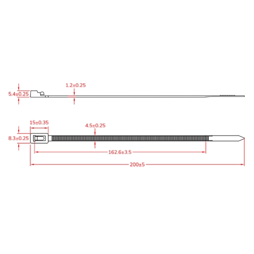 ●全長(mm)…200●幅(mm)…4.5●厚み(mm)…1.2●最大径(mm)…50●入数(本)…100●ループ引張強度(kgf)…22●使用温度範囲…-10~85℃●材質…ナイロン66●RoHS対応品●結束部のツメを押さえれば簡単に外せるので、繰り返し使用可能です。 ●最小出荷単位: 1