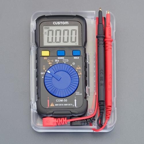 ●メーカー…カスタム(CUSTOM)●型番…CDM-50●仕様…本体●直流電圧…●レンジ 4V/40V/400V/600V●分解能 0.001V/0.01V/0.1V/1V●確度 ±(1.0%+3dgt)●入力インピーダンス 10MΩ以上●交流電圧…●レンジ 4V/40V/400V/600V●分解能 0.001V/0.01V/0.1V/1V●確度 ±( 2.0% + 5dgt )●入力インピーダンス 10MΩ以上※交流電圧の確度保証は正弦波に限る。●直流電流…●レンジ 400μA/40mA/400mA●分解能 0.1μA/0.01mA/0.1mA●確度 ±(2.0 %+5dgt)●交流電流…●レンジ 400μA/40mA/400mA●分解能 0.1μA/0.01mA/0.1mA●確度 ±(2.0%+5dgt)●抵抗…●レンジ 400Ω/4kΩ/40kΩ/400kΩ/4MΩ/40MΩ●分解能 0.1Ω/0.001kΩ/0.01kΩ/0.1kΩ/0.001MΩ/0.01MΩ●確度 ±(2.0%+5dgt)●開放電圧 約0.5V●周波数…●レンジ 5Hz/50Hz/500Hz/5kHz/50kHz/100kHz●分解能 0.001Hz/0.01Hz/0.1Hz/0.001kHz/0.01kHz/0.1kHz●確度 ±(0.5%+5dgt)●静電容量…●レンジ 50nF/500nF/5μF/50μF/100μF●分解能 0.01nF/0.1nF/0.001μF/0.01μF/0.1μF●確度 ±(5.0%+5dgt)●導通チェック…●ブザースレッシュホールド:約50Ω以下●開放電圧:約1.0V●ダイオードチェック…●レンジ:0.001V~1.999V●分解能:1mV●開放電圧:約2.1V●検波方式…平均値方式●表示…液晶、最大3999カウント●レンジ切替…オート/マニュアル●オーバーレンジ表示…’’OL’’マーク表示●ローバッテリー表示…電池電圧低下時、電池マーク表示●極性表示…自動切替、’’-’’のみ表示●サンプリング…約3回/秒●使用温湿度…0~+40℃、80%RH以下(但し、結露のないこと)●保存温湿度…-10~+60℃、70%RH以下(但し、結露のないこと)●サイズ…●本体:50(W)×12(D)×100(H)mm●ケース:81(W)×15.5(D)×114(H)mm●重量…●本体のみ:約42g(電池含む)●収納ケース:約35g●総重量:約100g(電池、テストリード、収納ケース含む)●テストリード長…約470mm●電源…CR2032(3V)リチウム電池×1個●電池寿命…約200時間●安全規格…IEC61010-1 準拠, CAT II 600V, CAT III 300V●校正…可●測定機能…●直流電圧/交流電圧/直流電流/交流電流/抵抗●ダイオードチェック/導通チェック(ブザー付)/周波数/コンデンサチェック/1.5 V乾電池チェック●オートパワーオフ…約15分(解除可能)●参考在庫数・商品詳細・サイズ情報はメーカー(参考)URLからもご確認いただけます。 ●最小出荷単位: 1