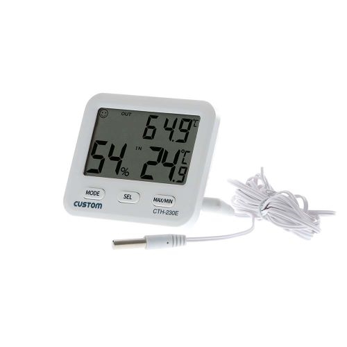 ●メーカー…カスタム(CUSTOM)●型番…CTH-230E●測定範囲…室内温度:-10.0~50.0℃室外温度:-50.0~70.0℃湿度:10~90%RH●分解能…温度:0.1℃湿度:1%RH●測定精度…温度:±1℃(0~+40℃)、±2℃(それ以外)湿度:±5%RH(+25℃、40~80%RH)、±8%RH(それ以外)●センサータイプ…温度(内部センサー):サーミスタ温度(外部センサー):サーミスタ湿度:セラミック抵抗式●表示更新頻度…1回/10秒●時計機能…12/24時間表示●外部センサー…長さ:3m防水規格:IPX7●サンプリング…1回/約10秒●使用温湿度…-10 ~ +50 ℃、10 ~ 90%RH以下(但し、結露のないこと)●保存温湿度…-10~+50℃、10 ~ 90%RH以下(但し、結露のないこと)●サイズ…80(W)×21(D)×70(H)mm●重量…約64g(外部センサー除く、電池含む)●電池…単4電池×1本(付属)●電池寿命…約1年間 (アルカリ乾電池使用時)●機能…・スヌーズ機能付き目覚まし機能・MAX/MIN表示●付属品…・外部温度センサー・取扱説明書(保証書付)●校正…可●内部センサーにより温湿度、外部センサーにより温度測定が可能です。●壁掛け、スタンド、マグネット貼り付けの3通りで設置できます。●※付属電池はテスト電池ですので新しい電池をご購入下さい。●参考在庫数・商品詳細・サイズ情報はメーカー(参考)URLからもご確認いただけます。 ●最小出荷単位: 1