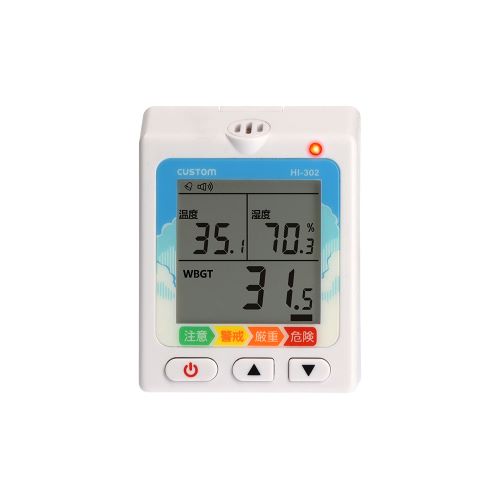 ●メーカー…カスタム(CUSTOM)●型番…HI-302●測定項目…温度、相対湿度、WBGT●測定範囲…温度:0~+50.0度相対湿度:20.0~90.0%RHWBGT:0.0~50.0度●分解能…温度:0.1度相対湿度:0.1%RHWBGT:0.1度●測定精度…温度:±0.6度(+20.0~+50.0度)、±1.0度(左記以外)相対湿度:±5%RH(+30.0~+90.0%RH)、±10%RH(左記以外)WBGT:±2.0度●測定間隔…約15秒毎●アラーム音量…70 dB、OFF●使用温湿度…0~+50度、10~90%RH以下(但し、結露のないこと)●保存温湿度…-10~+55度、10~90%RH以下(但し、結露のないこと)●サイズ…59(W)×23(D)×78(H)mm●重量…約80g(電池含む)●材質…ABS樹脂●電源…単4形乾電池×2本(付属)●機能…・熱中症危険レベルアラーム・MAX/MINメモリ機能●付属品…・取扱説明書(保証書付き)・ベルト●校正…可(気温、相対湿度)●注意…・本器は熱中症や風邪の発症を完全に防止できる製品ではありません。 風邪や熱中症は、周囲環境の温度・湿度・輻射熱等の影響や、個人の年齢・性別・健康状態、その時の活動状況(運動や労働状況等)など、様々な要因に影響されて発症します。これらの特性を良くご理解いただいた上で、あくまでも目安としてご使用ください。・製品の特性を充分発揮させるために、直射日光が当たらない室内・屋外にてご使用下さい。●屋内での使用可能●熱中症危険レベルをアイコンとアラームでお知らせします。●4種類の設置方法(フック穴、ベルトループ、三脚取り付け穴、卓状置き)※製品に三脚は付属していません。●※付属電池はテスト電池ですので新しい電池をご購入下さい。 ●最小出荷単位: 1