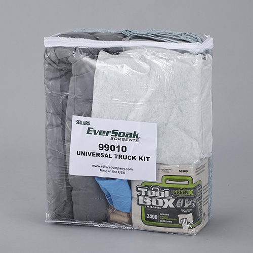 水や油などの液体用吸収材と、手袋や保護めがね等の小物が丈夫なジッパーバッグに入った便利なキットです