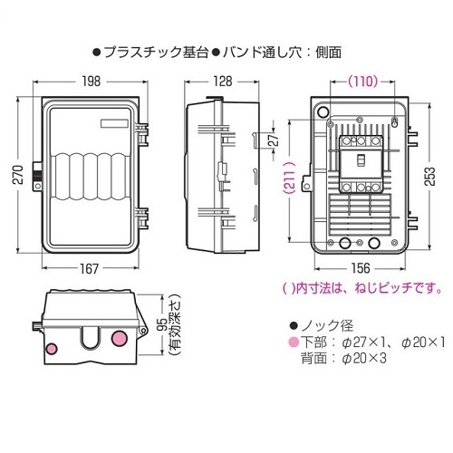 ●メーカー…未来工業●型番…WB-2J●取付スペース…ELB:3P・60AF×1●サイズ…198(W)×128(D)×270(H)mm●有効深さ…95mm●重量…540g●バンド通し穴…側面にあり(通し穴幅:27mm)●ノック径…下部:φ27mm×1、φ20mm×1背面:φ20mm×3●材質…ABS樹脂●カラー…ベージュ●横開き●プラスチック製ですから軽量で、アース工事が不要です。●耐衝撃性、耐候性に優れた防雨構造●プラスチック基台●扉は本体と分離できます。●参考在庫数・商品詳細・サイズ情報はメーカー(参考)URLからもご確認いただけます。 ●最小出荷単位: 1