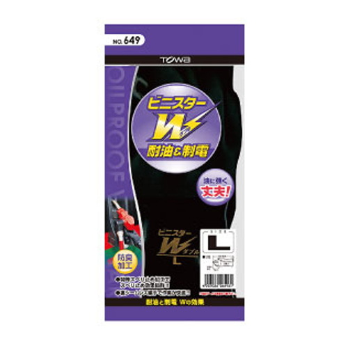 ●メーカー…東和コーポレーション(TOWA)●型番…649●商品名…ビニスターW●サイズ…M●全長(mm)…260●掌周り(mm)…214●中指長さ(mm)…71●材質…表:塩化ビニール裏:綿・アクリル(導電繊維)●厚み(mm)…1.57●カラー…ブラック●用途…石油荷役、石油精製、給油作業、自動車関連での油作業、塗装作業、印刷工場、化学工場などに。●裏編手に導電繊維を編み込み、手袋表面に導電性のある塩化ビニールをコーティングしていますので、静電気対策などに適しています。●塩化ビニールをコーティングしているため、天然ゴム製の手袋に比べて油に強く、劣化しにくい手袋です。●耐油、耐摩耗性を強化し、指・手のひらにスベリ止め加工を施していますので、油を扱う作業に適しています。●裏布は指先まで縫いしろのないシームレス編手で、手触りがよく作業が快適です。●参考在庫数・商品詳細・サイズ情報はメーカー(参考)URLからもご確認いただけます。 ●最小出荷単位: 1
