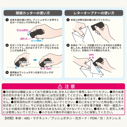 ●メーカー…サンスター文具●型番…S3720799●商品名…開梱カッター&レターオープナー SHUTTO(シュット)●サイズ…70×30×12mm●刃長(mm)…1●重量…17g●材質…本体:ABS・POMブレード:ステンレス●カラー…ブラック●開梱カッターとレターオープナーの2WAY仕様●ダンボールの開梱には「カッター機能」で、手紙や封筒の開封には「レーターオープナー機能」。●宅配物や郵便物はコレ1つで解決!●マグネット付●参考在庫数・商品詳細・サイズ情報はメーカー(参考)URLからもご確認いただけます。 ●最小出荷単位: 1