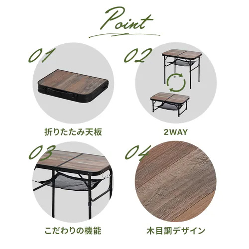 ●メーカー…アイリスオーヤマ(IRIS OHYAMA)●型番…FOT-600●使用時サイズ(収納時サイズ)W×D×H(mm)…600×400×535/245(325×70×430)●重量(kg)…1.8●材質…天板:合成樹脂化粧繊維板(メラミン樹脂)フレーム:アルミニウム(エポキシ樹脂塗装)●耐荷重…約30kg●高さ調節ができる2WAYタイプ●折りたたみ式でコンパクト収納。●メラミン加工で傷つきにくく熱にも強い、耐久性に優れた天板。●メッシュ棚・ゴミ袋をかけるフック付きで、便利な機能搭載。●屋外に馴染む木目調のデザイン。●参考在庫数・商品詳細・サイズ情報はメーカー(参考)URLからもご確認いただけます。 ●最小出荷単位: 1