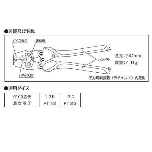 ●圧着範囲…1.25mm2・2mm2●全長…240mm●重量…410g●裸圧着端子(FT形)専用●参考在庫数・商品詳細・サイズ情報はメーカー(参考)URLからもご確認いただけます。 ●最小出荷単位: 1
