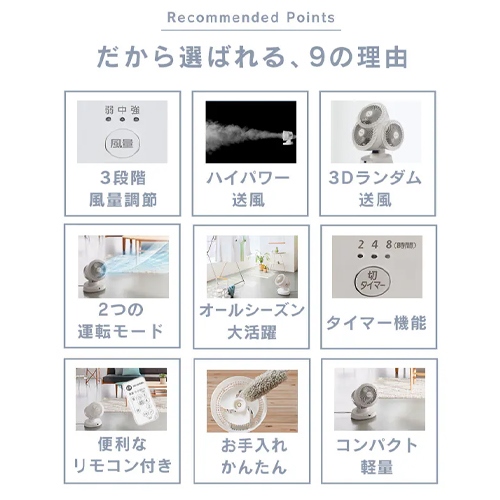 ●メーカー…アイリスオーヤマ(IRIS OHYAMA)●型番…PCF-BC15T●羽根径…15cm羽根●適用床面積…16畳●サイズ…222(W)×222(D)×296(H)mm●重量…2.0kg●消費電力(50/60Hz)…38/40W●電源…AC100V(50/60Hz)●カラー…ホワイト●コード長…1.5m●切タイマー…2・4・8時間●首振り角度…上70°●風量3段階調整(弱・中・強)●首振り機能付(上下・左右)●屋外の空気を取り込んだり、屋内の空気を排出することができ、こまめな換気でウイルス対策にも効果的です。●強制攪拌モード:ワンタッチで上下左右の首振りを最大風量で開始。お部屋の空気を攪拌し、温度差を少なくします。●リズム:ゆっくりとした風量の変化でより自然に近い風に●3Dランダム送風:左右・上下どちらも設定すれば3Dランダム送風に。効率よく、お部屋のすみずみまで風を届けます。●リモコン付(本体背面に収納可能)●使いやすい操作パネル●コンパクトなのにパワフル送風な、上下左右首振り型のサーキュレーターです。●エアコンと併用で、冬は暖かい空気を足元へ、夏は涼しく冷気を部屋全体へ。お部屋の換気対策にも。●空気循環から部屋干しまで、1年中使えます。●風の到達距離は17m。空気の循環や換気をスピーディに行えます。●特殊形状スパイラルグリルで空気の流れをコントロールし、より直進性の高い気流を作り出します。●参考在庫数・商品詳細・サイズ情報はメーカー(参考)URLからもご確認いただけます。 ●最小出荷単位: 1