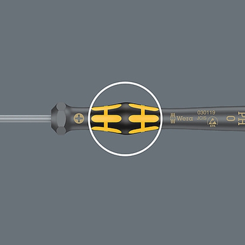 ●メーカー…Wera●型番…※ESCOオリジナルセット品●商品名…1578A ESD●<セット内容>…6本組●刃幅×刃厚(mm)…1.2×0.25、1.5×0.23、1.8×0.30、2.0×0.40、2.5×0.4、3.0×0.50●軸長(mm)…40、60、80●軸径(mm)…2.0、2.5●ハンドル長(mm)…97●全長(mm)…137、157、177●静電対策仕様。●ESDの表面電気抵抗は≧10^9 ohm以下です。●ブラックポイント刃先仕上げによりネジにぴったりフィットし、先端の耐食性を高めます。●ハンドル出力側にある精密ゾーンにより、作業中の微調整を簡単に行えます。●先端のパワーゾーンは、柔らかい材質を組み込んでいるので、ネジ締め作業の際、高いトルク伝達ができ、ネジからのカムアウトを防ぎます。●空転キャップの下にある早回しゾーンにより、スピーディにドライバーを回せます。●早回しキャップは、手をサポートし、迅速かつ正確に作業できます。●導電性グリップ●工具袋付●ポケットは透明タイプ、折りたたみ可能、折りたたみの為のパッチンが左右に付いています。●参考在庫数・商品詳細・サイズ情報はメーカー(参考)URLからもご確認いただけます。 ●最小出荷単位: 1