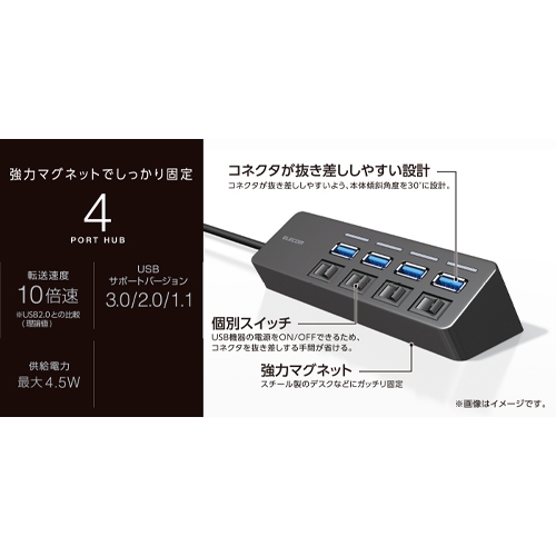 ●メーカー…エレコム●型番…U3H-S418BBK●ポート数…パソコン側:1ポート、周辺機器側:4 ポート●インターフェイス…USB3.0(USB2.0インターフェース接続時は、USB2.0互換で動作、USB1.1インターフェース接続時はUSB1.1互換で動作)●対応OS…Windows 11/10/8.1/7/Vista/XP、macOS Ventura 13/macOS Monterey 12/macOS Big Sur 11/Macintosh OS X 10.11 ※各OSの最新バージョンへのアップデートや、サービスパックのインストールが必要になる場合があります。●サイズ…123.9×36.6×40.5(H)mm(ケーブルを除く)●重量…約106.1g●ケーブル長…約30.0cm(コネクター除く)●コネクタ形状…パソコン側:USB A(オス)×1USB機器側:USB A(メス)×4●最大転送速度…USB3.0スーパースピード/5Gbps(理論値)、USB2.0ハイスピード/480Mbps(理論値)、USB1.1フルスピード12Mbps(理論値)●電源方式…バスパワー●供給可能電流…USB3.0接続時:4ポート合計720mA以内(各ポート180mA未満)USB2.0接続時:4ポート合計400mA以内(各ポート100mA未満)●カラー…ブラック●動作環境…温度5~40度、湿度30~80%(結露なきこと)●給電電流がUSB2.0に比べて80%向上し、複数の機器をつないでも安定した動作が可能です。●転送速度5Gbpsと従来のUSB2.0の約10倍の転送速度(理論値)を実現するUSB3.0に対応したUSBハブです。●USB3.0対応のパソコン・機器であれば、大量のデータも高速に転送可能です。●USB2.0/1.1環境でも使用できるので、USB2.0/1.1対応のパソコン・機器でもそのまま接続可能です。●コネクタを抜き差ししやすい斜め設計を採用しています。●USB機器の電源をON/OFFに切り替えられる個別スイッチタイプで、個別アクセスランプを搭載しています。●スチール製のデスクなどにしっかりと固定できる強力マグネットを装備しています。●底面にラバー素材を設置し、マグネットを使わないデスクでも快適に使用できます。●ACアダプター不要のバスパワー専用タイプです。●本製品はUSBポートを増設するための製品です。本製品を使用してスマートフォン・タブレットを充電することはおすすめできません。●参考在庫数・商品詳細・サイズ情報はメーカー(参考)URLからもご確認いただけます。 ●最小出荷単位: 1