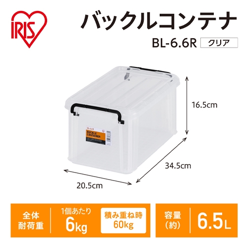 ●メーカー:アイリスオーヤマ(IRIS OHYAMA) ●型番:BL-6.6R ●サイズ(mm):内寸:280×155×150(H) 外寸:345×205×165(H) ●重量:560g ●入数:1個 ●材質:ポリプロピレン ●容量:約6.5L ●耐荷重:6kg(1個あたり) ●カラー:クリアー ●積み重ね可能 ●プラスチック製バックル仕様のフタ付きコンテナです。 ●厚みのある持ち手部分により重い物の運搬にも最適です。 ●バックル成形部分は握りやすい凹面仕上げ ●前モデルEA5 ●最小出荷単位: 1