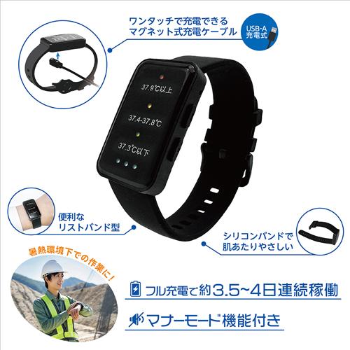 ●サイズ…25×10.5×43(H)mm●材質…ABS、PC、シリコン●重量…11g●防塵・防水性能…IP67●色…ブラック●使用電池…リチウムイオンバッテリー(110mAh)●連続使用時間…3.5~4日●充電時間…約2時間●音量…68dB●測定間隔…毎15秒に1回●充電方法…USB充電(マグネット式)●耐熱温度…~80度●付属品…マグネット式充電ケーブル(ACアダプターなし)、取扱説明書(保証書)●熱中症リスクを色、音、振動で危険を通知します。●起動後は15秒ごとに自動で測定して、結果をお知らせします。●※注意事項※・本製品は医療機器ではございません。・本製品は体調や疾患の判断を担保するものではありません。・本製品には時計機能はございません。 ●最小出荷単位: 1