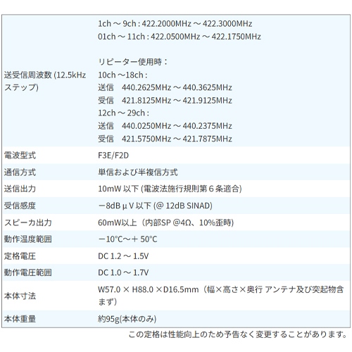 ●メーカー…スタンダード(STANDARD) ●型番…SR70A-B ●送信出力…10mW ●連続使用時間…アルカリ電池:約33時間 ニッケル水素電池:約39時間 ●電源…単3電池×1本(別売) (EA758YA-3A) ●サイズ…57(W)×16.5(D)×88(H)mm ●重量…95g(本体のみ) ●カラー…ブラック ●通話距離の目安…見通しの良い場所:約1km~2km 市街地:約100~200m ●付属品…ベルトクリップ 取り付けビス ●送受信周波数 (12.5kHz ステップ)…1ch ~ 9ch : 422.2000MHz ~ 422.3000MHz 01ch ~ 11ch : 422.0500MHz ~ 422.1750MHz リピーター使用時: 10ch ~18ch : 送信 440.2625MHz ~ 440.3625MHz 受信 421.8125MHz ~ 421.9125MHz 12ch ~ 29ch : 送信 440.0250MHz ~ 440.2375MHz 受信 421.5750MHz ~ 421.7875MHz ●電波型式…F3E/F2D ●通信方式…単信および半複信方式 ●受信感度…-8dB μ V 以下 (@ 12dB SINAD) ●スピーカ出力…60mW以上(内部SP @4Ω、10%歪時) ●動作温度範囲…-10度~+ 50度 ●定格電圧…DC 1.2 ~ 1.5V ●動作電圧範囲…DC 1.0 ~ 1.7V ●クラス最薄の16.5mmのスリム・コンパクトボディ ●単3形乾電池1本の省電力設計 ●免許・資格不要 ●交互通話20ch+中継通話27ch ●IP67 ●音声ミュート機能 前面の’’MUTE’’ボタンをワンタッチで受信中の音声をミュート(消音)することができます ●相手が通信可能範囲にいるかどうかを定期的に確認しアイコン表示と電子音でお知らせ ●158通りの豊富なグループ分け(トーン方式50通り/DCS方式108通り) ●バッテリーインジケータ(電池積算使用時間インジケータ) ●選択呼出し機能 ●大型ディスプレイ&チャンネル表示方向設定機能 ●イヤホン断線検出機能 ●サブチャンネルセレクト機能/オートチャンネルセレクト機能 ●秘話モード ●PTTディレイ機能 ●受信専用モード ●ワイヤレスクローン機能 ●受信チャンネルをサーチするスキャン機能 ●エマージェンシー機能 ●バックノイズを軽減するコンパンダ機能 ●参考在庫数・商品詳細・サイズ情報はメーカー(参考)URLからもご確認いただけます。 ●最小出荷単位: 1