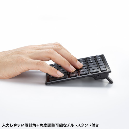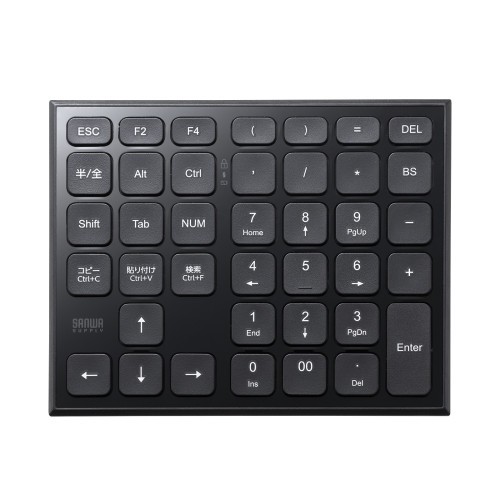 ●メーカー…サンワサプライ ●型番…NT-BT27BK ●キー数…39キー ●接続方式…Bluetooth ●キースイッチ…パンタグラフ ●キーピッチ…19mm ●キーストローク…1.6±0.2mm ●動作力…60±5g ●印刷方式…シルク印刷 ●電池…単四乾電池 1本 ●連続動作時間…240時間 ●通信範囲…10m ●プロファイル…HID(Human Interface Device Profile) ●適合規格…Bluetooth 5.0・Class 2 ●静音…あり ●アイソレーション…あり ●付属品…製品本体、取扱説明書(パッケージに記載)、保証書(パッケージに記載)、単四乾電池1本(テスト用) ●サイズ…W147.7×D117.8×H18mm ●重量…約95g ●対応機種…Bluetoothを搭載し、Windowsの動作するパソコン ●対応OS…日本語版Windowsのみに対応 ●Excelに最適なキーを搭載した表計算テンキーです。 ●一般的なテンキーに搭載しているキーに加え、「ESC」「F2」「F4」「半角/全角」「Alt」「Ctrl」「Shift」「Tab」「コピー」「貼り付け」「検索」「(」「)」「=」「,」を追加しました。 ●Bluetooth 5.0に適合したBluetoothテンキーです。Bluetoothを内蔵した機器とレシーバー無しで接続できます。 ●Bluetoothを内蔵したパソコンであればUSBポートをふさがずに使用することができます。 ●静音キーを採用しており、静かなオフィスなど入力音が気になる場所などに最適です。 ●ノートパソコンと同じパンタグラフキー採用。キーの端を押しても快適に入力できます。 ●キーが独立したアイソレーションタイプです。爪の引っ掛かりを軽減します。 ●入力しやすい傾斜角、さらにチルトスタンド付きで角度の調整が可能です。 ●電池の消耗を抑えるオン・オフスイッチ付きです。 ●専用ドライバのインストールが不要な、接続するだけですぐに使えるUSB接続タイプです。 ●NumLock非連動の安心設計です。 ●Windows標準ドライバで動作可能です。 ●参考在庫数・商品詳細・サイズ情報はメーカー(参考)URLからもご確認いただけます。 ●最小出荷単位: 1