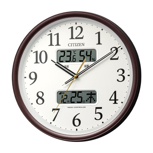 ●メーカー…CITIZEN(シチズン) ●型番…8FYA06-006 ●サイズ(mm)…φ350×60 ●周波数…40kHz/60kHz自動選局 ●電源…単3電池×2本(別売) ●測定範囲…温度:-9.9~49.9度、 湿度:20~90%RH ●測定精度…温度:±2度 湿度:±10%RH ●風防材質…ガラス ●重量…1.3kg ●機能…カレンダー(2099年12月31日まで表示可能)、温・湿度表示、電池交換時期お知らせ機能 ●使用温度範囲…-10~50度(結露しないこと) ●液晶可読温度…0~40度 ●時間精度…標準電波受信直後の表示精度 秒針:±1秒 時分針:目盛りに対して±3度 標準電波を受信しない場合 平均月差:±30秒 ※温度が5~35度のときのクオーツ精度 ●デジタル表示…LCD ●表示項目…温度・湿度・月日・曜日 ●電池寿命…約1年(標準電波の受信に成功しているとき) ●電池交換時期…秒針が12時位置に常時停止 ●電波時計機能…標準電波を受信して日時を自動修正 ●受信機能…ON/OFF切り替え可能 ●自動受信回数…12回/日 ●自動受信時刻…0、2、4、6、8、10、12、14、16、18、20、22時各時間帯の16分20秒に受信開始 ●手動時刻合わせ…デジタル合わせ ●防滴防塵…なし ●付属品…木ねじ1本、取扱説明書 ●プラスチック枠 ●スイーブ秒針 ●コチコチ音がしない連続秒針の液晶表示付電波掛時計です。 ●大きな文字板で、時間も温湿度もカレンダーも見やすくなっています。 ●ユニバーサルデザインフォント使用 ●参考在庫数・商品詳細・サイズ情報はメーカー(参考)URLからもご確認いただけます。 ●最小出荷単位: 1