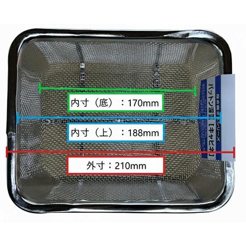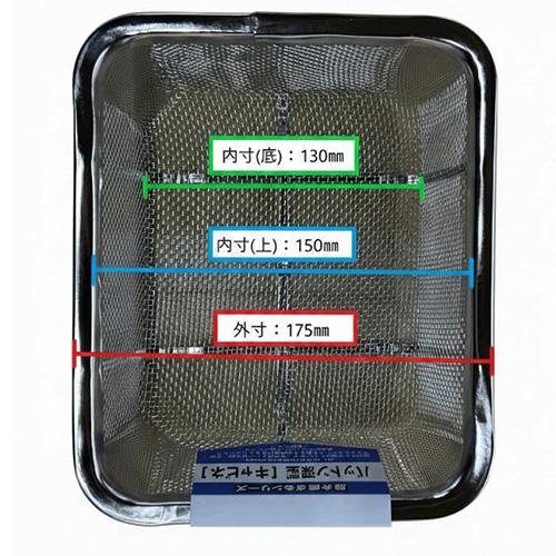 ●サイズ(mm)…210×175×75(H) ●目開(mm)…1.70 ●メッシュ…11 ●線径(mm)…0.6 ●重量…180g ●材質…18-8 ステンレス(SUS304) ●耐食性・耐久性に優れたステンレス製です。 ●錆びにくく、衛生的です。 ●参考在庫数・商品詳細・サイズ情報はメーカー(参考)URLからもご確認いただけます。 ●最小出荷単位: 1