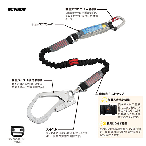 ●メーカー…藤井電工 ●型番…THL-NV93SV-21KS-BK-R23 ●長さ…収縮時:1150~1250mm 伸長時:1600mm ●材質…伸縮式ストラップ:ポリエステル フック:アルミ合金 ●重量…約780g ●耐荷重…100kg以下(装備重量含む) ●ストラップ幅…32mm ●最大自由落下距離…2.3m ●落下距離…4.4m ●口開き…構造物側フック:50mm 人体側カラビナ:9mm ●カラー…ブラック ●付属品…フックハンガー×1 ●フルハーネス用 ●第一種ショックアブソーバ ●伸縮自在・軽量・コンパクトでキンクの起きないランヤードです。 ●使わないときは短く縮んでいますので、移動時の引っかかりなどを抑えることができます。 ●伸縮自在ストラップは、袋ベルト二重構造で取り替え時期が明確に分かります。 内層のオレンジベルトが見えてくれば取替えのサインです。 ●構造物側のフックは、外れ止め装置と安全装置にアルミ合金を採用した軽量型で、単管パイプに直接掛けられる大口径フックです。 ●フック連結部が360°回転することにより、自由な操作が可能です。 ●人体側の小型カラビナは、アルミ合金を採用した軽量型です。 ●参考在庫数・商品詳細・サイズ情報はメーカー(参考)URLからもご確認いただけます。 ●最小出荷単位: 1