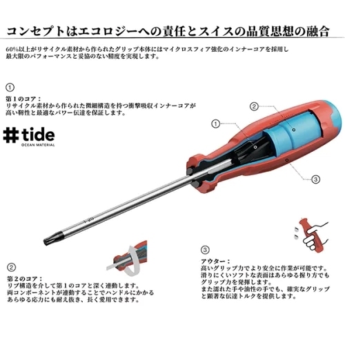 ●メーカー…PB SWISS TOOLS ●型番…PB38677.3-75RE ●用途…Oリングの取り外しや各種こじり作業に ●仕様…フックタイプ ●全長…153mm ●軸径…3mm ●軸長…75mm ●材質…特殊スチール ●重量…19.5g ●フック先端で、Oリング外し、ホース・配線の引き回し、クリップ除去に最適 ●精密加工の先端採用、硬度、耐摩耗性に優れています。 ●人間工学に基づいたデザインで、快適で疲れにくい作業を実現しました。 ●油や水で濡れた手で握っても滑りにくく、安全で正確に作業ができます。 ●化学的耐性や機械的強度があり、過酷な現場での使用に耐えます。 ●グリップエンド部の先端形状アイコン表示で、工具の取り違えも防止します。 ●ブレード部のシリアル番号で原料段階の製造過程まで遡ることができます。 ●【SwissGrip Evoの特長】 ・従来の丸形グリップから、わずかに三角形に近い(トライアングル形状)に改良 ・グリップ形状により、握ったときに手のひらにしっかりフィットします。 ネジを回すためのトルク伝達率が従来品より約25%も向上しています。 少ない力で、より確実にネジを締める・緩めることができます。 ●【3層構造(3Kコンポジット)のハイテク素材】 内側(コア):力をしっかり受け止める硬い素材(リサイクル素材) 中間:内側のコアと外側の層を結合する素材 外側(表面):手に吸い付くような滑りにくい柔らかい素材 ●参考在庫数・商品詳細・サイズ情報はメーカー(参考)URLからもご確認いただけます。 ●最小出荷単位: 1