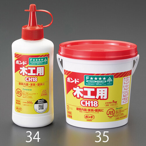 ●メーカー…コニシ ●型番…#40117 ●商品名…CH18 ●内容量…500g ●使用温度範囲…10~35度 ●色…乳白色 ●可使時間…直ちに(20度) ●硬化時間…2~3時間(20度) ●完全硬化時間…12時間(20度) ●主成分…酢酸ビニル樹脂 ●用途…建築内装木工事(健康住宅対応)、家具・建具の製作 ●適用材質…木、合板、紙、布、フェルト、パーティクルボード、ハードボード、インシュレーションボード、MDF、メラミン化粧板、石こうボード、発泡スチロールなど ●使用方法…均一に塗布、圧締して1~4時間静置する。 ●水性 ●健康住宅対応でホルムアルデヒドを使用していない、より安全性の高い木工用接着剤 ●塗布時ののびがよく、壁面でもタレにくい ●速乾性があり、乾燥後はほぼ透明 ●木材接着後に切削加工しても刃を傷めない ●F☆☆☆☆取得 ●JAIA4VOC ●参考在庫数・商品詳細・サイズ情報はメーカー(参考)URLからもご確認いただけます。 ●最小出荷単位: 1